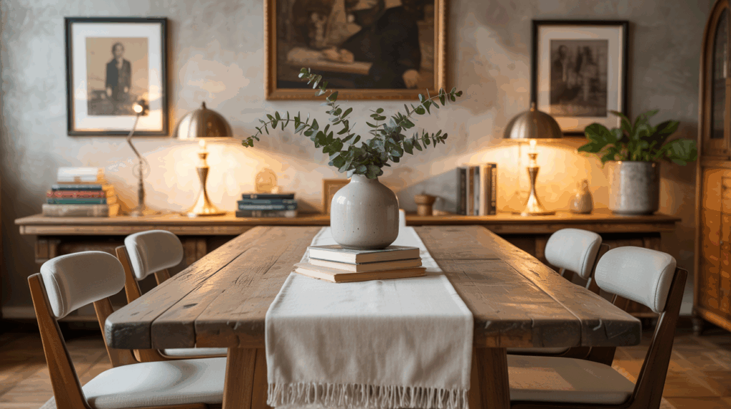 What to Look For: Search for tables with simple, clean lines and quality construction. Farmhouse tables, mid-century designs with tapered legs, or traditional pedestal tables all work beautifully. Focus on solid wood construction—oak, walnut, maple, or pine are excellent options.